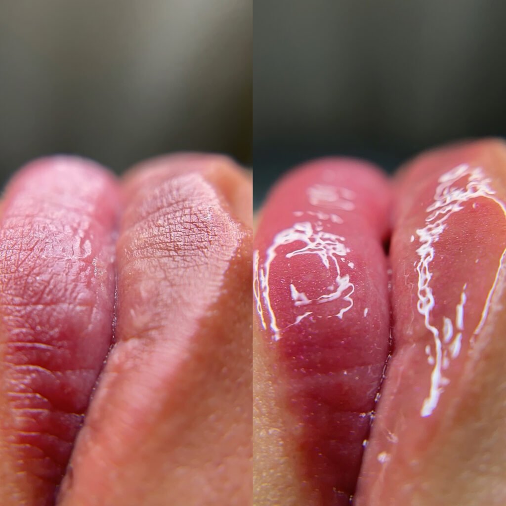 Pigmentação leve que realça a cor natural dos lábios, deixando o efeito de “lábios corados”.